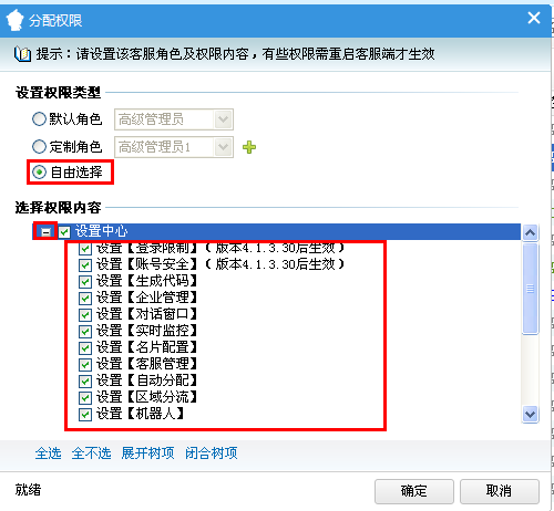 【設置中心】→【客服管理】→【客服名單】→【分配權限】→【自由選擇】→點開【+】→勾選對應權限→【確定】