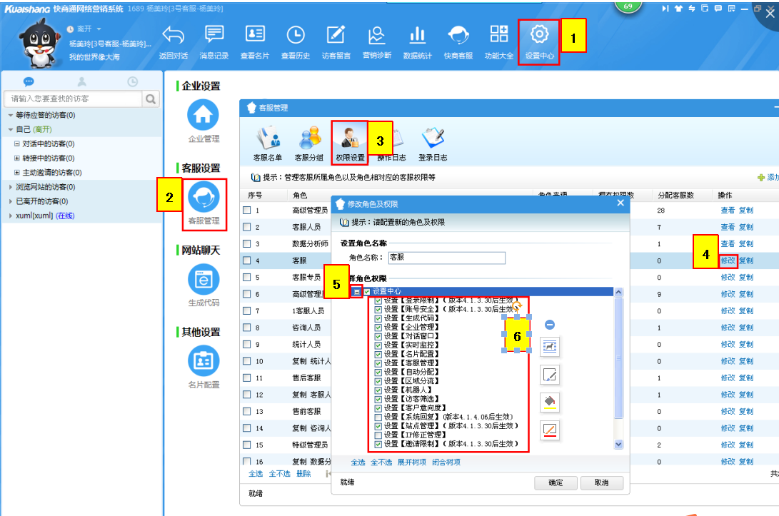【設置中心】→【客服管理】→【權限設置】→【修改】→點開【+】→勾選對應權限→【確定】