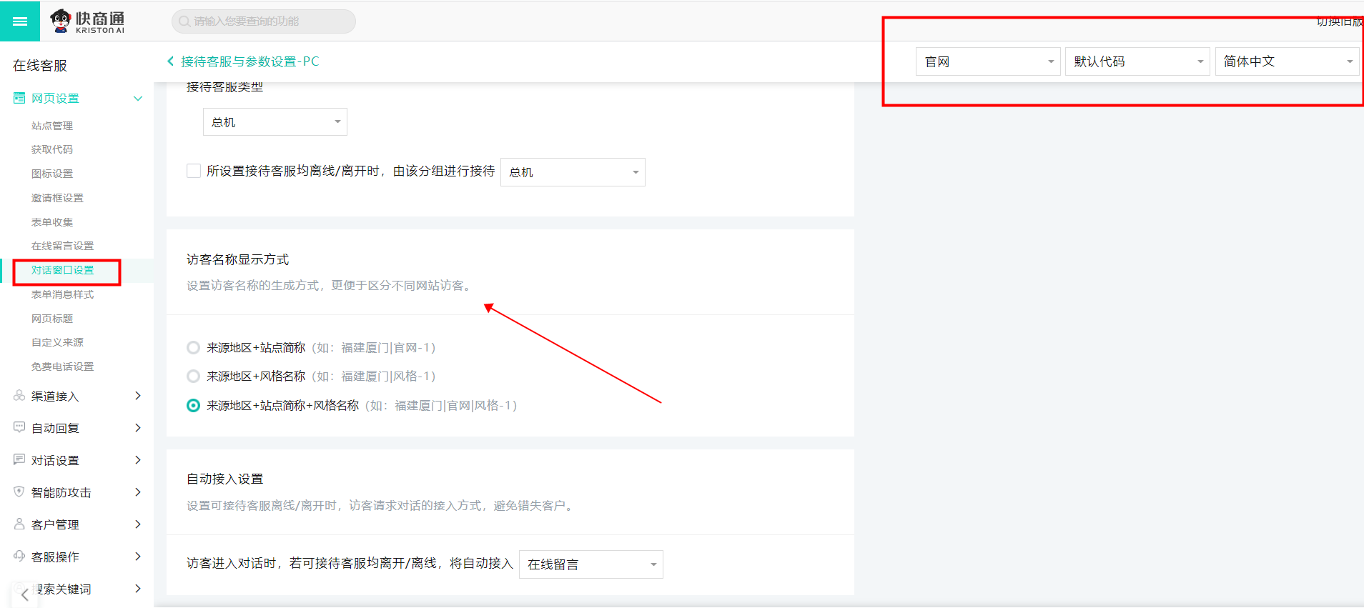 設置流程:【設置中心】→【站點管理】→【網頁設置】→【對話窗口設置】→【接待客服與參數】→【訪客名稱顯示方式】→【站點風格】