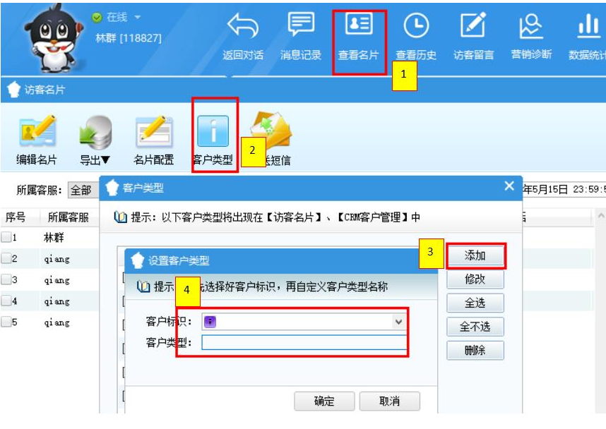 方法二:點擊【查看名片】→【客戶類型】→【添加】→選擇【客戶標識】→填寫【客戶類型】→【確定】