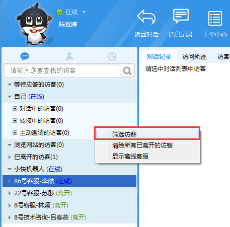 對話列表的空白處點擊右鍵→【篩選訪客】,詳見下圖: