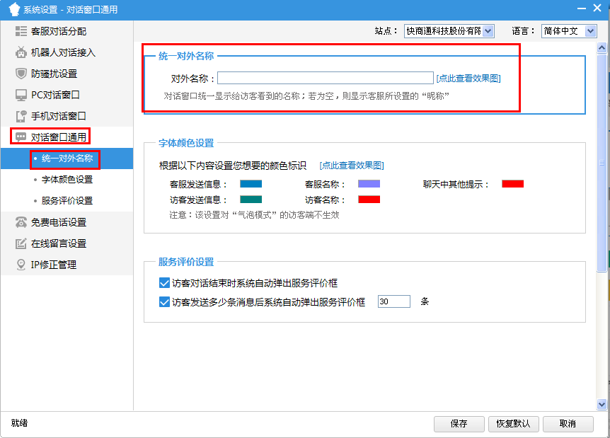 - 步驟:【設置中心】->【生成代碼】->【電腦生成代碼】->【對話窗口】->【對話窗口通用設置】->【對話窗口通用】->【統一對外名稱】,詳見下圖: