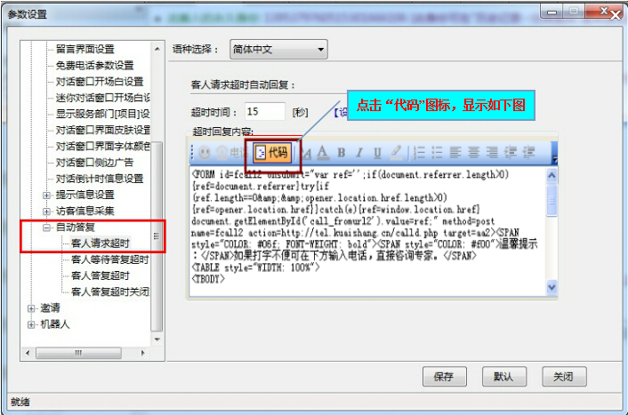登錄商務通后臺 —— 系統設置 —— 參數設置 —— 對話 —— 自動答復 —— 客人請求超時
