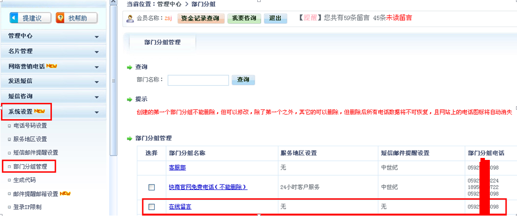 第二步:請將部門分組關(guān)聯(lián)好該號碼,詳見如下圖: