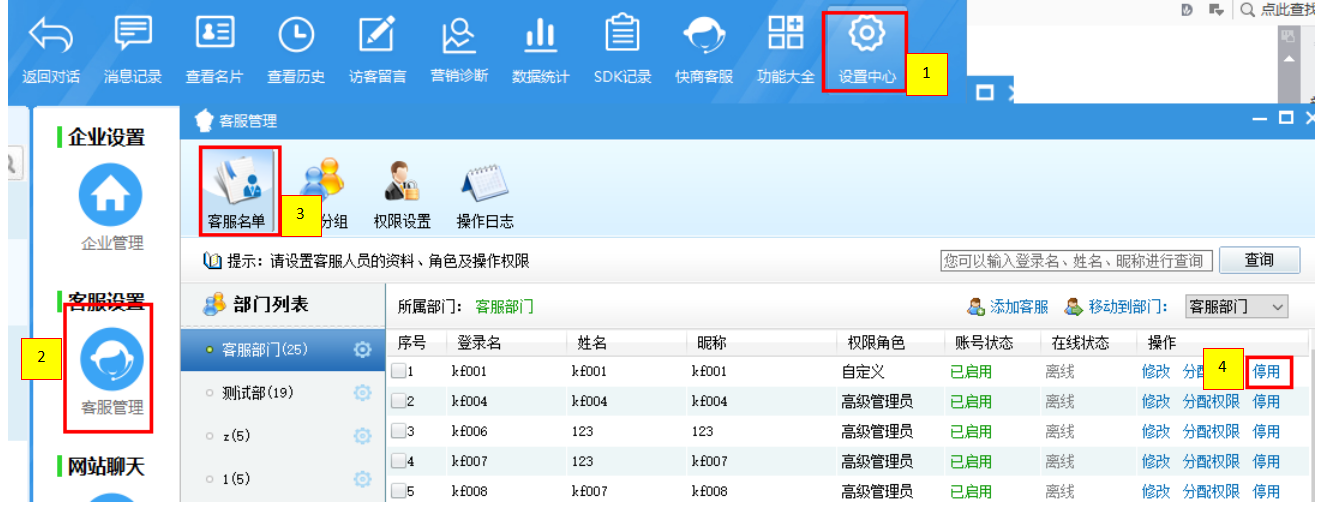 【設置中心】→【客服管理】→【客服名單】→【停用】