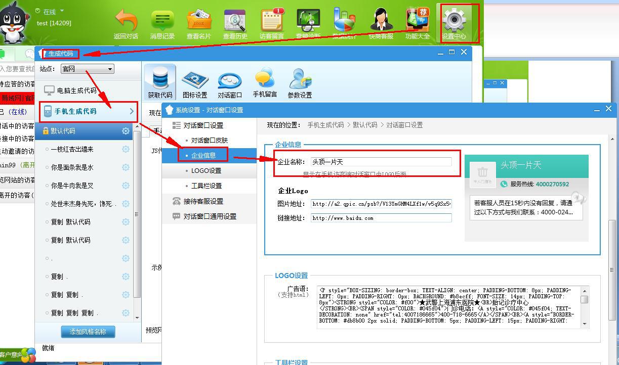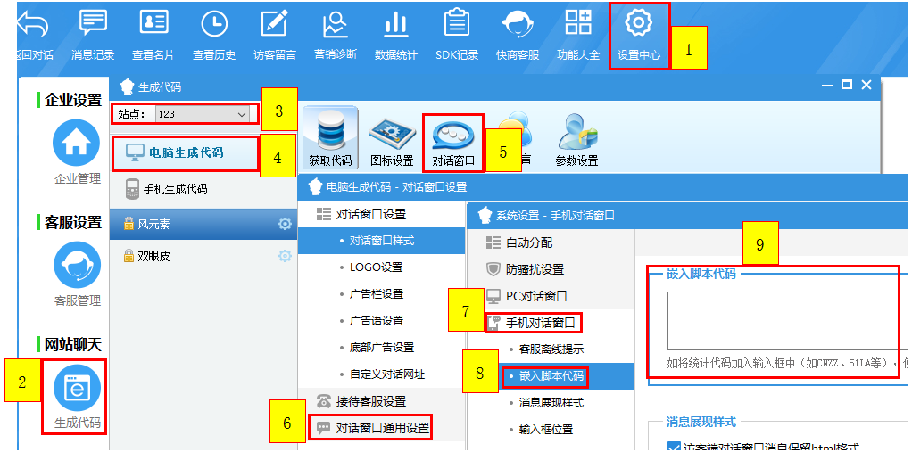 - 設置流程:【設置中心】→【生成代碼】→【選擇站點】→【電腦生成代碼】→【對話窗口】→【對話窗口通用設置】→【手機對話窗口】→【嵌入腳本代碼】→【設置第9步驟】