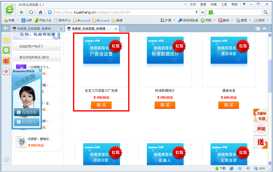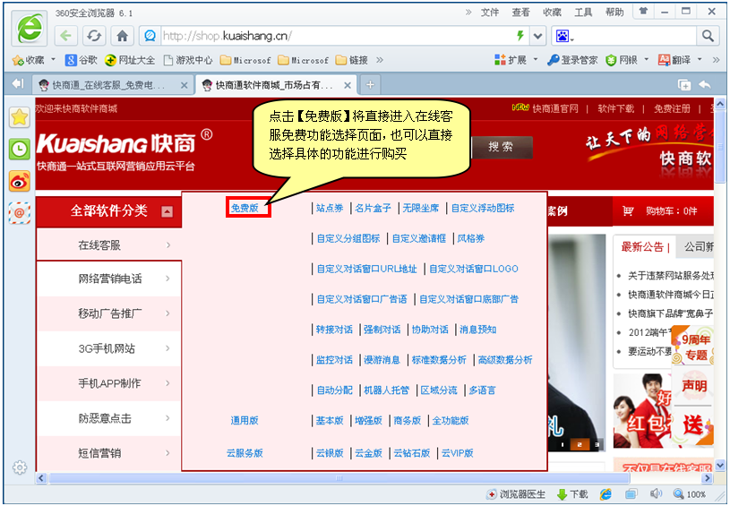 第一步:進入快商軟件商城(https://shop.kuaishang.cn/),點擊【在線客服】—【免費版】,選擇您要購買的功能,見如下圖: