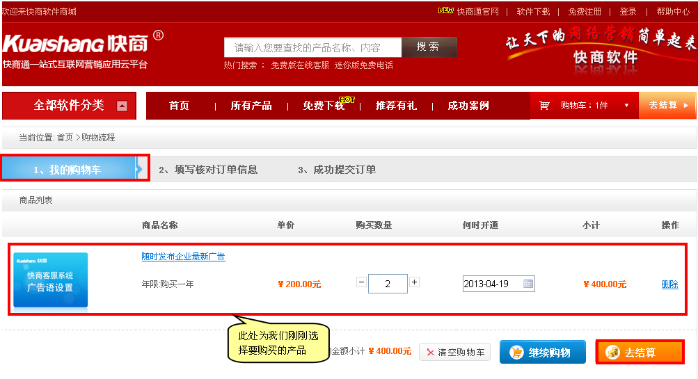 第四步:進入“我的購物車”,點擊【去結算】,見如下圖: