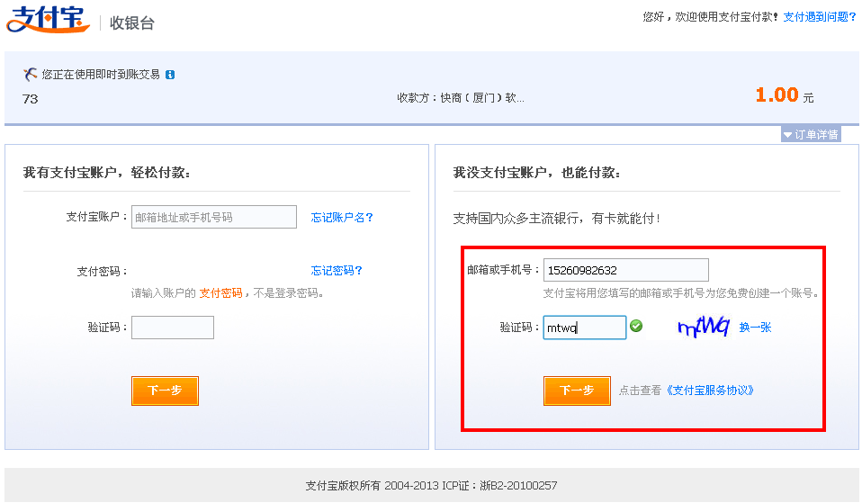 第九步:請按以下提示操作(或當前客戶沒有支付寶賬戶),見如下圖: