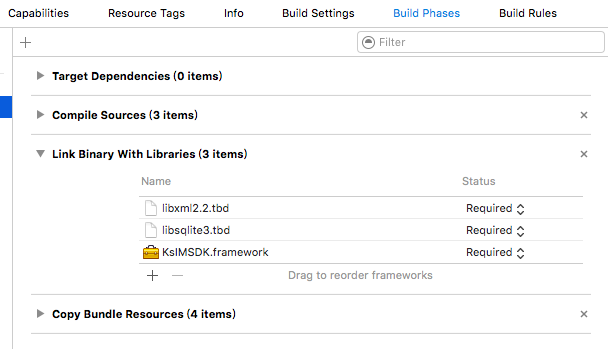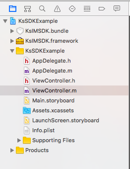 1. 將KsIMSDK.framework和KsIMSDK.bundle文件拷貝到工程目錄下(或其他適當(dāng)位置),然后把這兩個(gè)文件拖入Xcode的項(xiàng)目中。