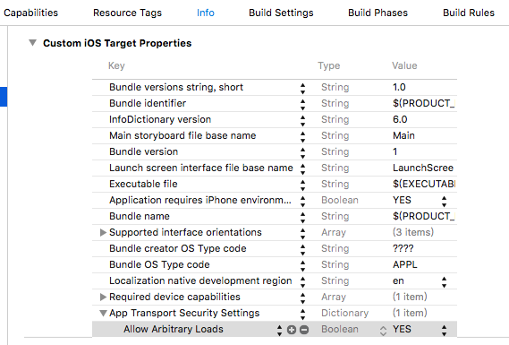 3. 在TARGETS的Info.plist中添加App Transport Security Settings,類型為Dictionary。在App Transport Security Settings下添加Allow Arbitrary Loads,類型為Boolean,值設(shè)為YES。