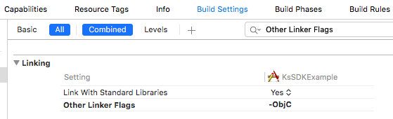 4. 在TARGETS的Build Settings下Other Linker Flags里面加入-ObjC標(biāo)志