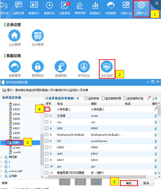 【設(shè)置中心】→【實(shí)時(shí)監(jiān)控】→【選中有監(jiān)控權(quán)限的客服】→【選中需要被監(jiān)控的人員】→點(diǎn)擊【確定】