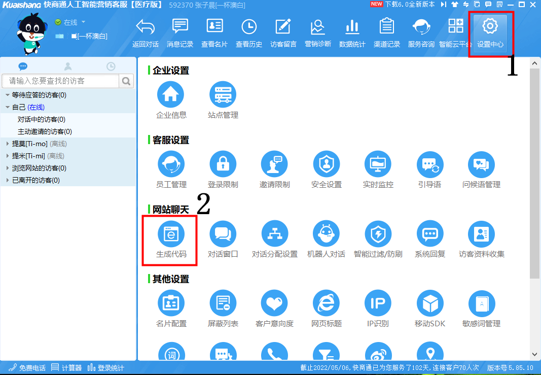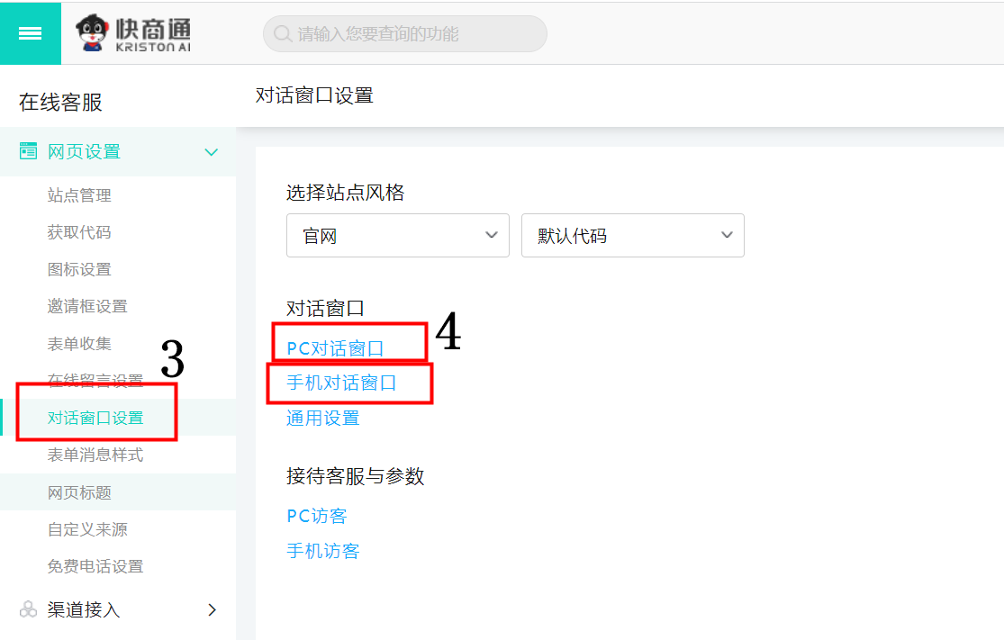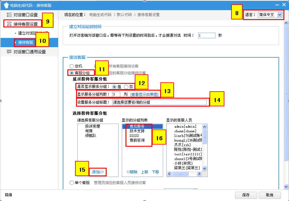 【設(shè)置中心】→【生成代碼】→選擇【站點(diǎn)】→【電腦或手機(jī)生成代碼】→選擇【風(fēng)格券】→【對(duì)話窗口】→【接待客服設(shè)置】→選擇【語言】→【接待客服設(shè)置】→【接待客服】→【客服分組】→【是否顯示客服分組】→【顯示服務(wù)分組列數(shù)】→【設(shè)置服務(wù)分組標(biāo)題】→【添加】