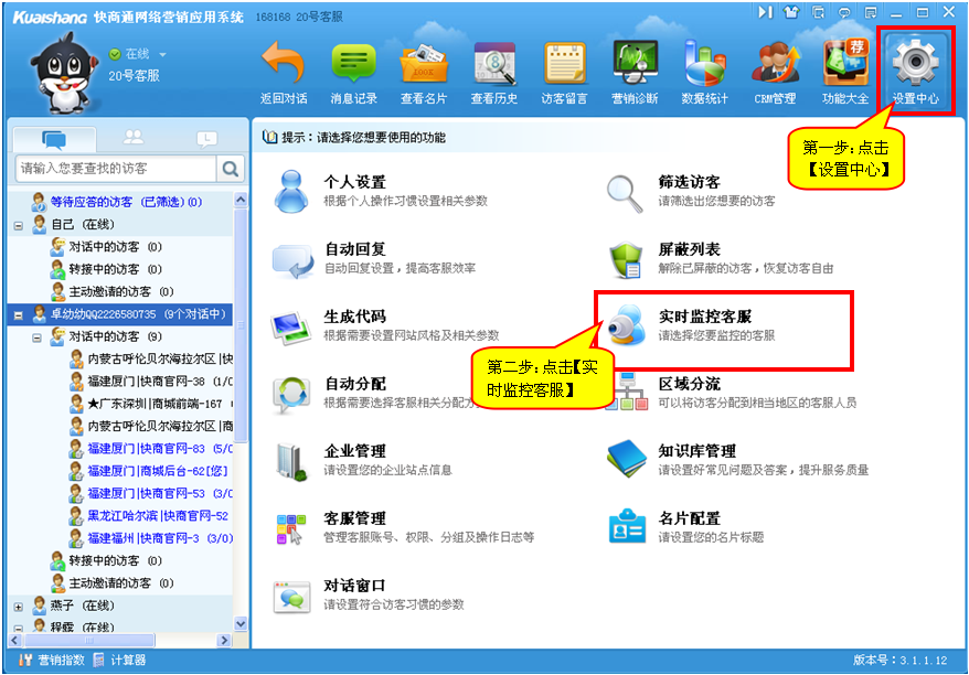 第一步:點擊【設置中心】——【實時監控客服】