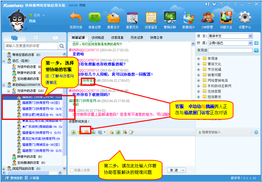 第三步:客服“魏巍”正在協助“卓幼幼”與訪客的對話,見如下圖: