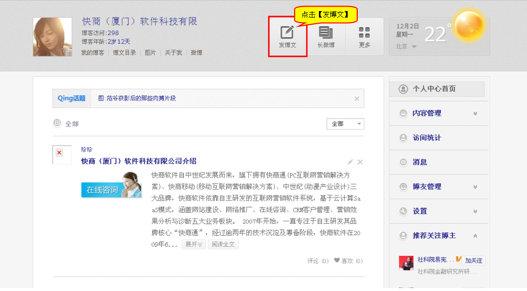 操作流程:點擊【發博文】-【編輯博文】,詳見如下圖:
