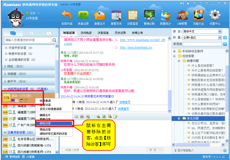 1、好處:當訪客一直騷擾你時,為了不影響你的正常使用同時又不失我們的服務,可移除它,對話列表自動消失,但訪客可正常進入對話;