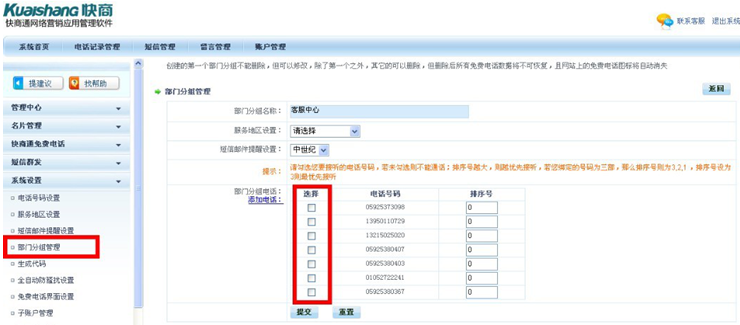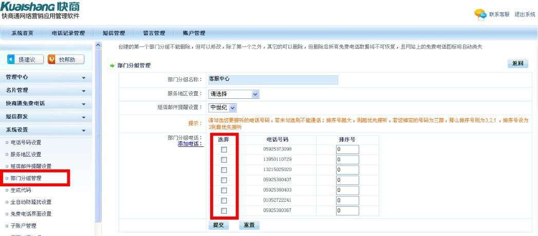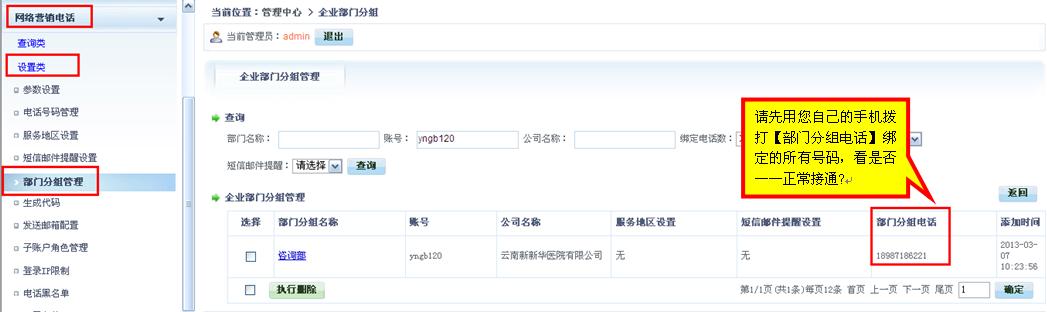 第六步:請查看【部門分組管理】中,綁定的電話號碼分別是電信固話運營商?電信手機運營商?聯通手機運營商?網通固話運營商?移動手機運營商?鐵通固話運營商?