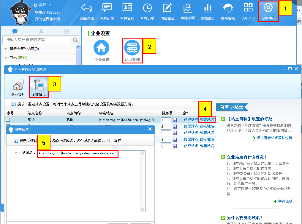 【設置中心】→【站點管理】→【企業站點】→【綁定域名】