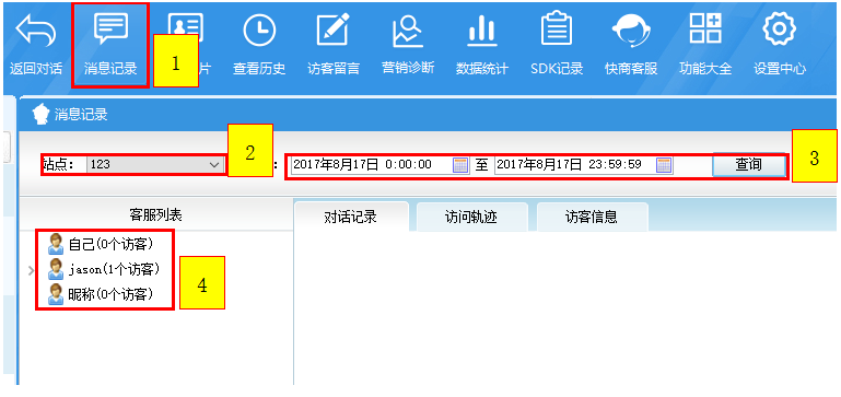 - 設置流程:【消息記錄】→【站點】→【選擇時間】→【選擇客服】