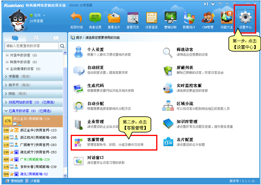 1)點擊【設置中心】—【客服管理】,見如下圖: