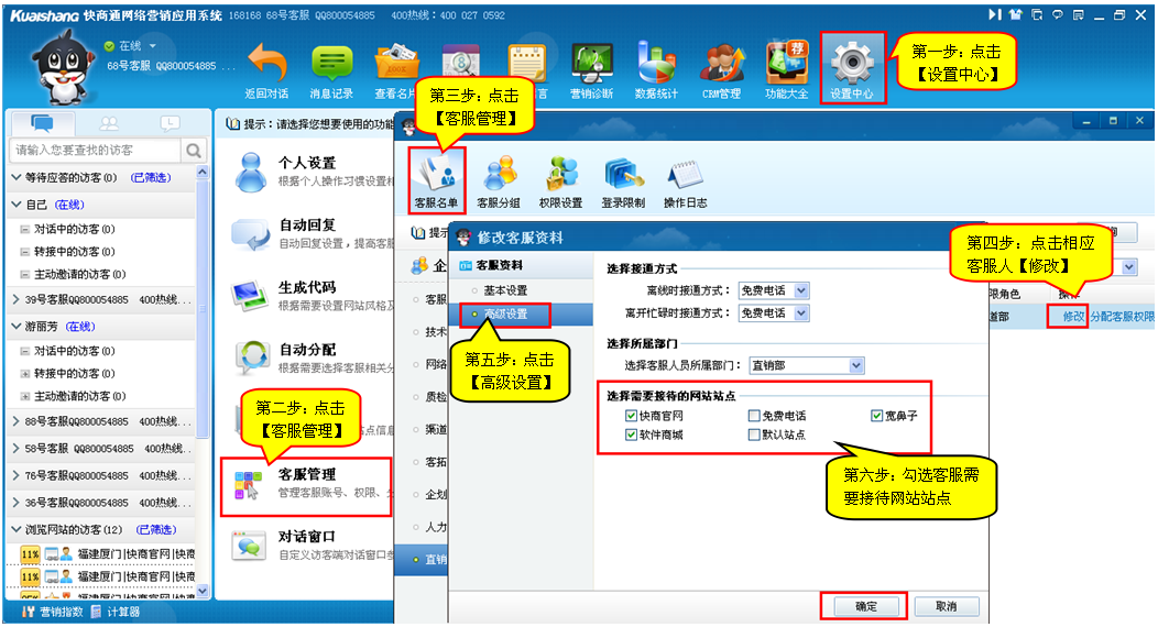 1、好處:可以指定相應的客服,接待相應的網站,一個客服可以接待一個網站也可以接待多個網站,或者是一個網站由多個客服接待。