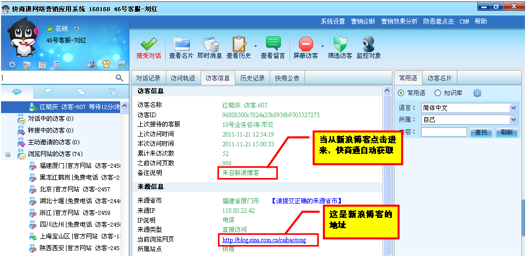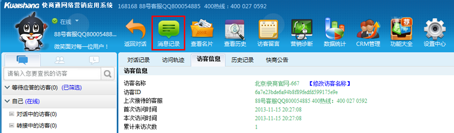 當“訪客”點擊“在線咨詢”圖標時,快商通將會自動獲取到當前訪客的情況,詳見如下圖: