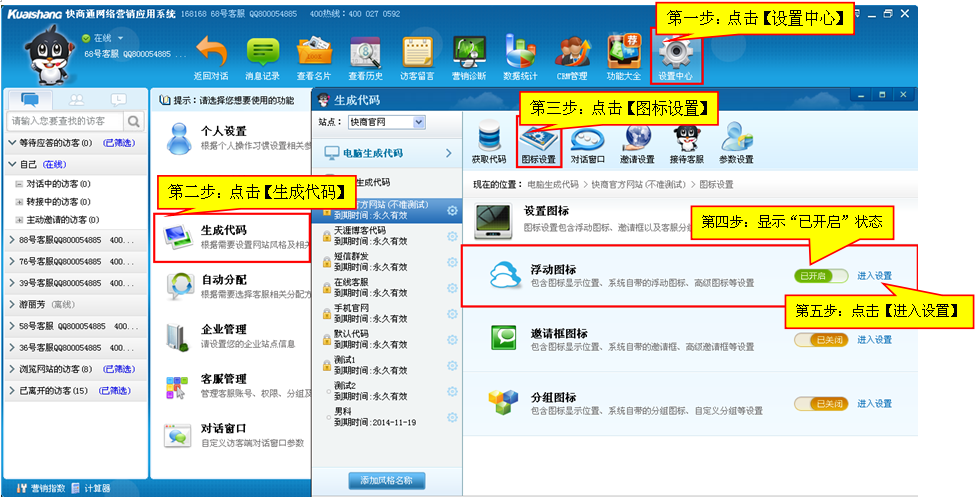 第一步:點擊【設置中心】—【生成代碼】—【圖標設置】—【進入設置】,詳見下圖: