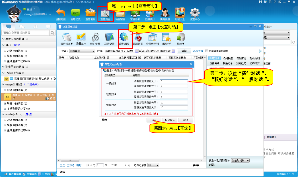 第二步:點擊【查看歷史】—【選擇站點】—【查詢的時間段】—【高級查詢】—【選擇一般對話】 詳見如下圖: