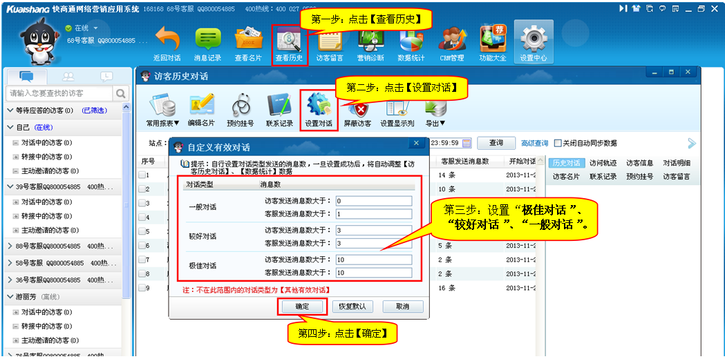 第二步:點擊【查看歷史】—【選擇站點】—【查詢的時間段】—【高級查詢】—【選擇一般對話】 詳見如下圖: