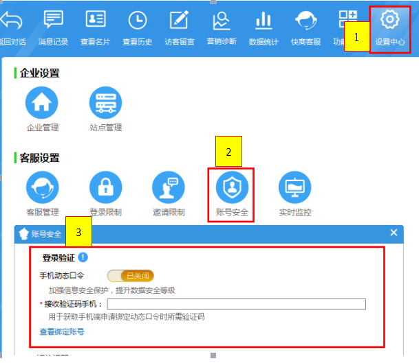 【登錄PC端在線客服】→【設置中心】→【賬號安全】→【開啟動態口令】→【輸入接受驗證碼手機】