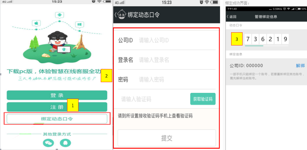 流程:安裝【手機端在線客服】→打開【手機快商通客服端】→點擊【綁定動態口令】→輸入對應的【ID、登錄名、密碼和驗證碼】→【綁定成功】