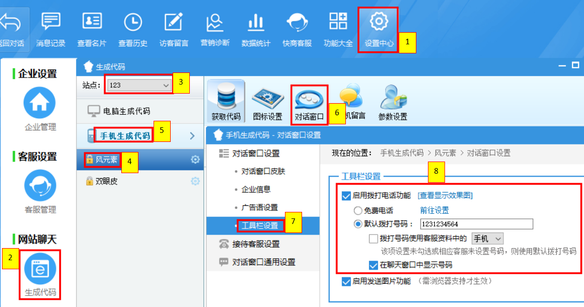 【設置中心】→【生成代碼】→【選擇站點】→【選擇風格卷】→【手機生成代碼】→【對話窗口】→【工具欄設置】→【啟用撥打電話功能】