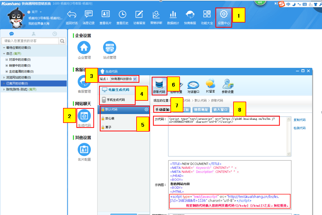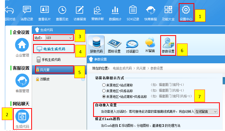【設(shè)置中心】→【生成代碼】→【選擇站點】→【電腦生成代碼】→【選擇風格券】→【圖標設(shè)置】→【開啟迷你對話框】