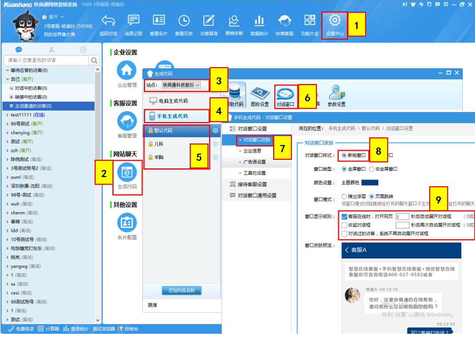 【設(shè)置中心】→【生成代碼】→選擇【站點】→【手機生成代碼】→選擇【風格券】→【對話窗口】→【對話窗口皮膚】→【新版窗口】→【窗口顯示規(guī)則】→【保存】