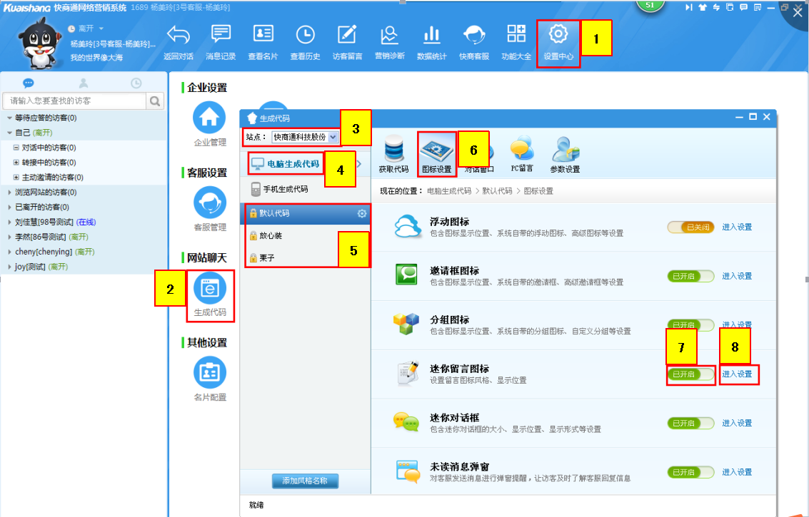 【設置中心】→【生成代碼】→【站點】→【風格卷】→【圖標設置】→【迷你對話框】