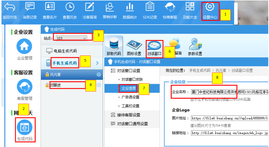 【設置中心】→【生成代碼】→【站點】→【風格券】→【手機生成代碼】→【對話窗口】→【企業信息】→【企業名稱】