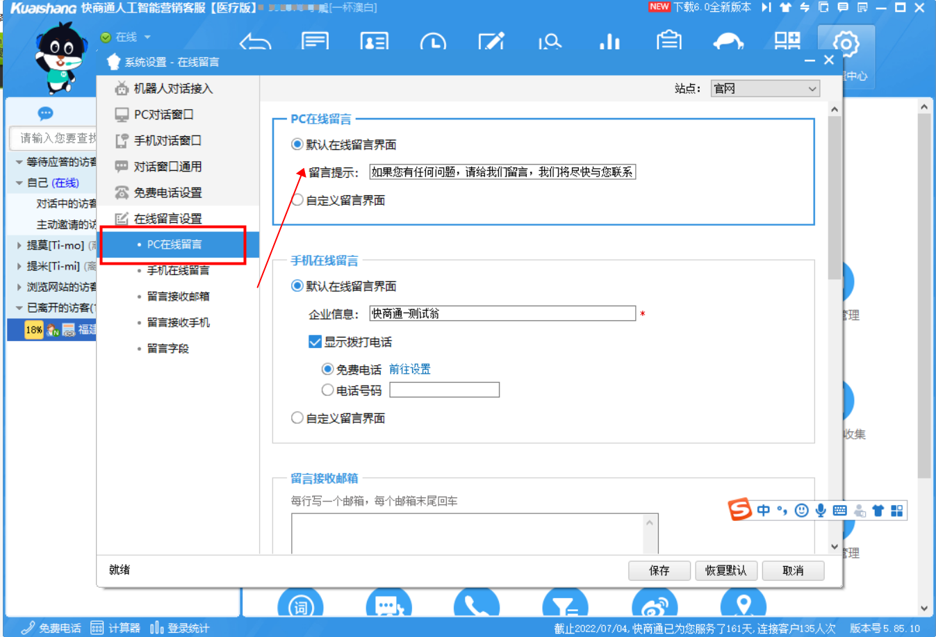 - 設(shè)置流程:【設(shè)置中心】→【對話窗口】→【在線留言設(shè)置】→【PC在線留言】