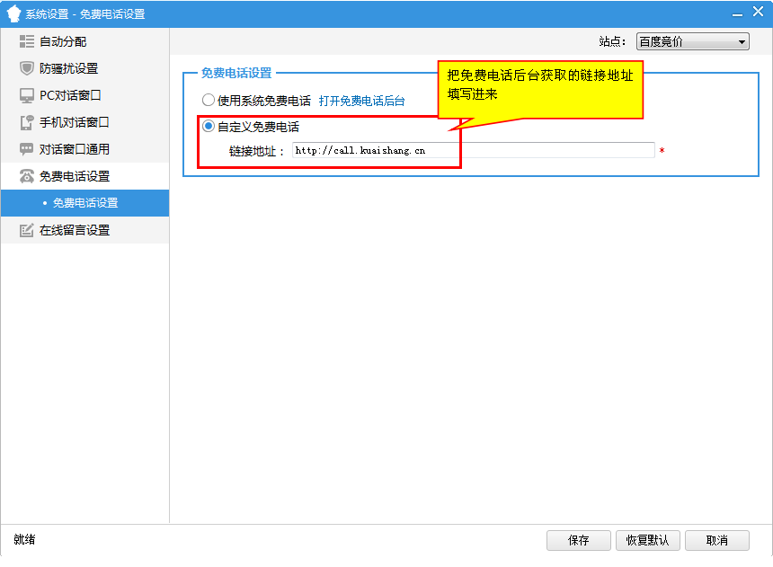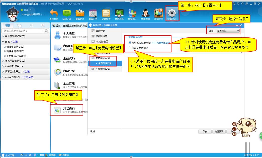 一、對話窗口的工具欄中免費電話按鈕(適用于使用快商通的免費電話或者第三方的免費電話產品)