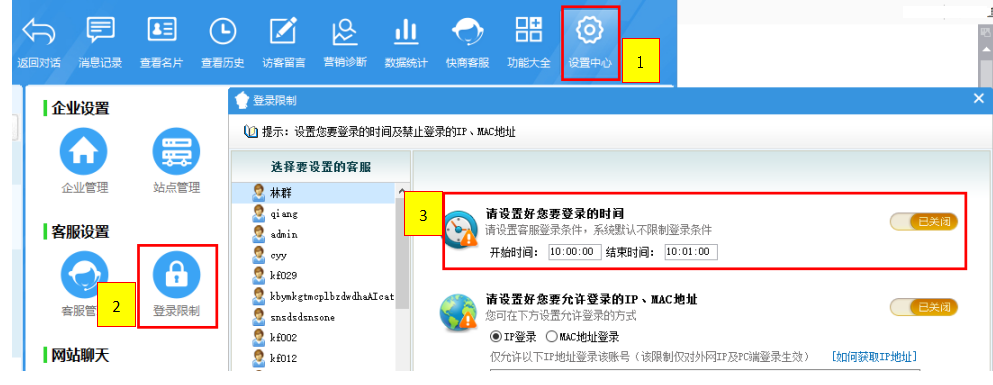 為了保證您的數據安全性,您可以設置上班時間,才能登錄在線客服系統。