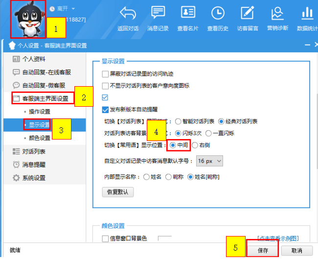 設置流程:【點擊LOGO】【客服端主界面設置】【顯示設置】【切換常用語顯示位置】【中間】【保存】