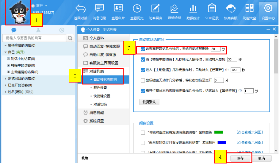 設置流程:【點擊LOGO】【對話列表】【自動轉狀態時間】【訪客離開網站幾分鐘后系統自動將其刪除】