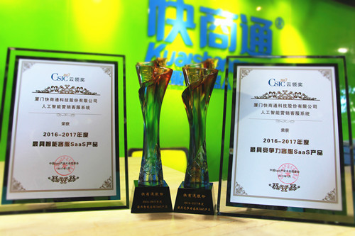 最后,備受業(yè)界關(guān)注的年度SaaS領(lǐng)域權(quán)威創(chuàng)新評選“云領(lǐng)獎”頒獎將燃爆全場,最具創(chuàng)新、最受歡迎和最具成長潛力的SaaS企業(yè)揭曉 。快商通一舉奪得2017中國SaaS產(chǎn)業(yè)大會“云領(lǐng)獎”“年度最具智能客服SaaS產(chǎn)品”、“年度最具競爭力客服SaaS產(chǎn)品”兩項重量級大獎,滿載而歸。